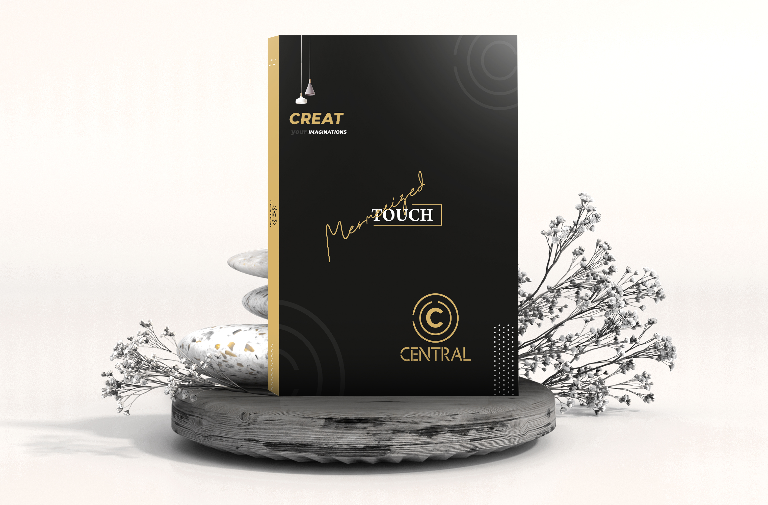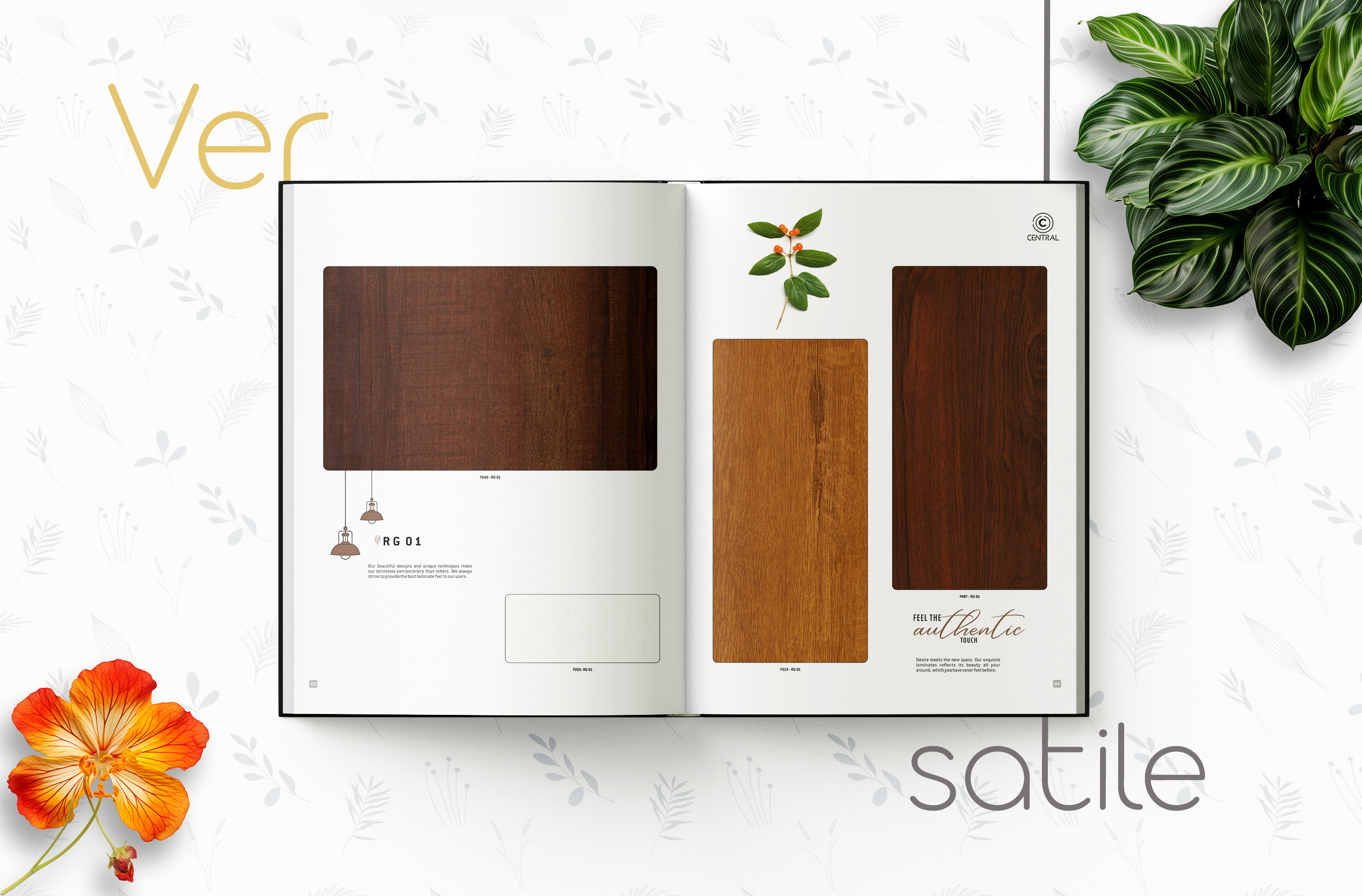The black title cover symbolizes elegance and sophistication, complemented by a gold title to evoke a sense of luxury and premium quality. The beige tones inside reflect warmth and versatility, creating a welcoming and adaptable aesthetic. The blend of bold exterior and subtle interior aims to mesmerize and engage, mirroring the captivating textures and finishes of Central's laminate collection.